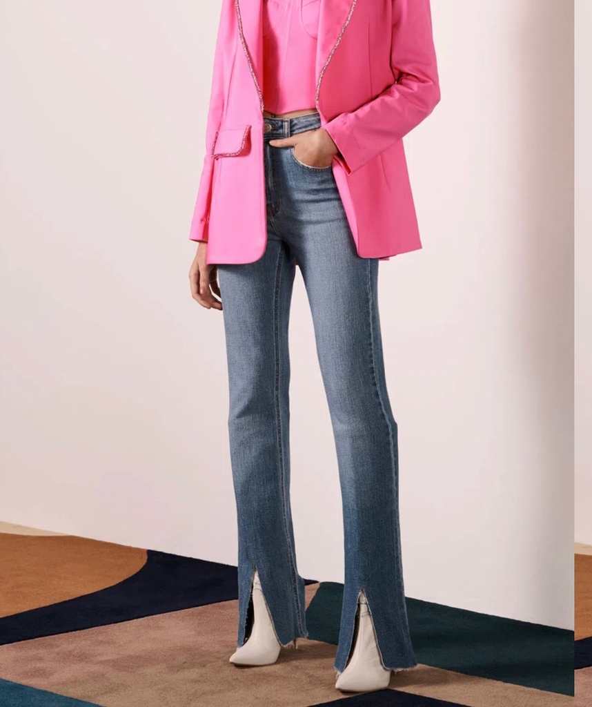 Calça jeans cintura alta. modelagem reta. detalhe de fenda na barra. dois bolos frontais simples e um bolso relógio. dois bolso posteriores simples. barra com acabamento a fio. fechamento frontal por zíper e botão de casa.