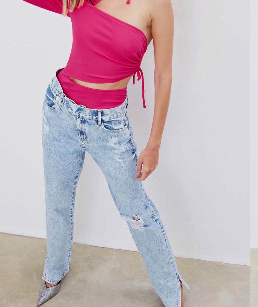 Desfrute do estilo único da nossa Calça Jeans Reta com Cós Assimétrico Transpassado e Fendas na Barra! Esta peça moderna e sofisticada oferece um toque de ousadia ao seu visual, com seu design inovador. Perfeita para quem busca uma mistura de elegância e irreverência. Adquira já e destaque-se com um look cheio de personalidade!