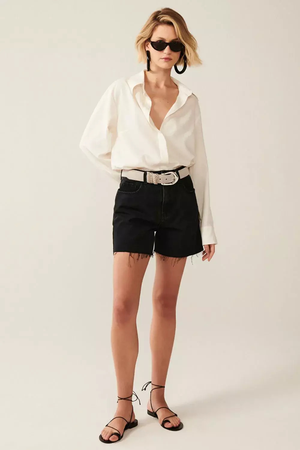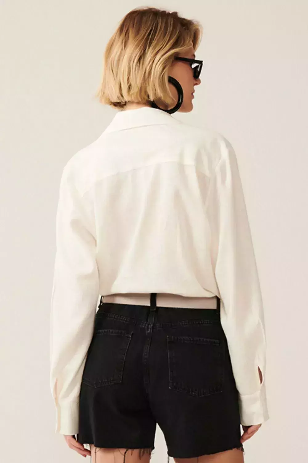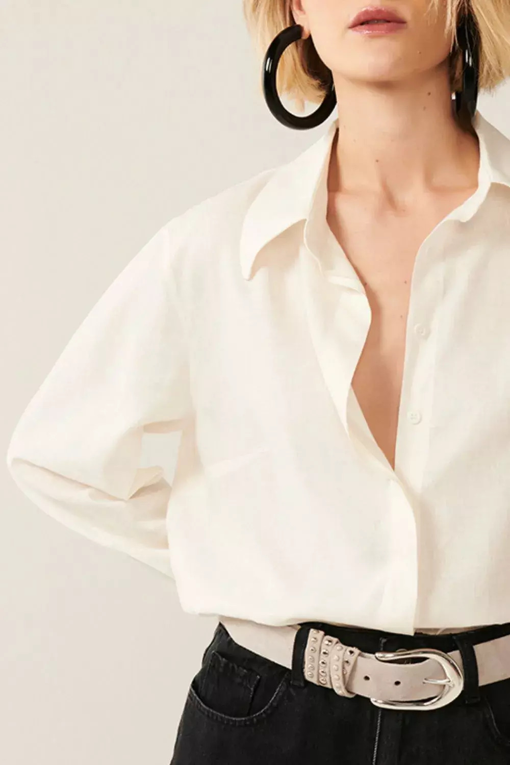 Camisa sofisticada em cambraia de linho misturada com viscose, destacando-se pela elegância da vista coberta.