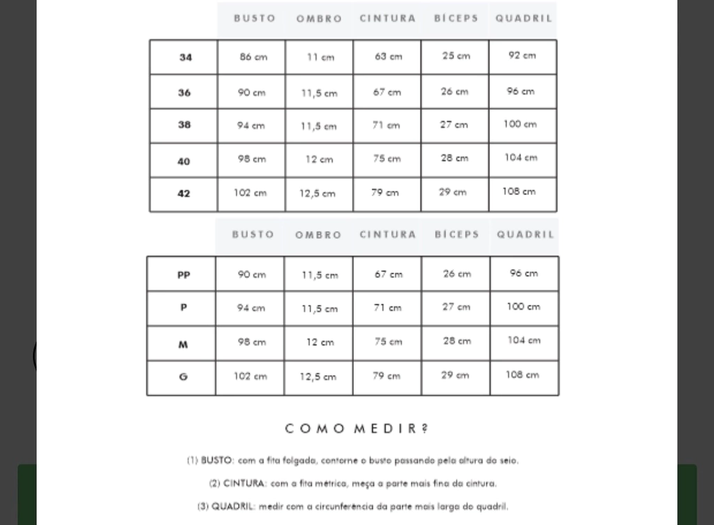 PP - busto 89 a 92 - cintura 64 a 67 - quadril 94 a 97