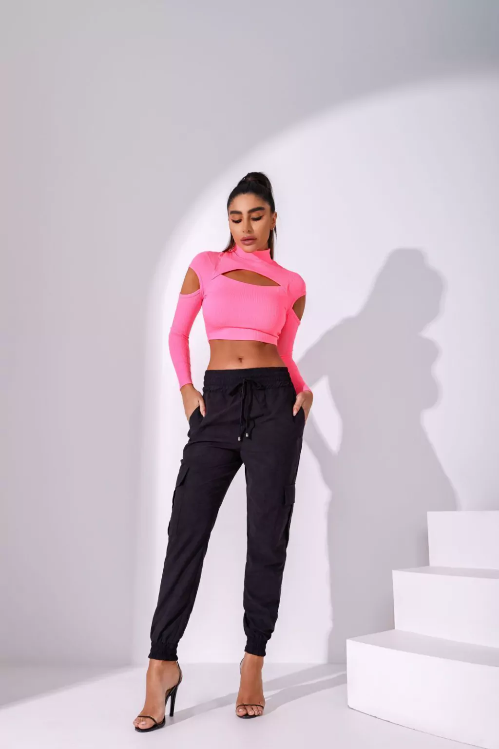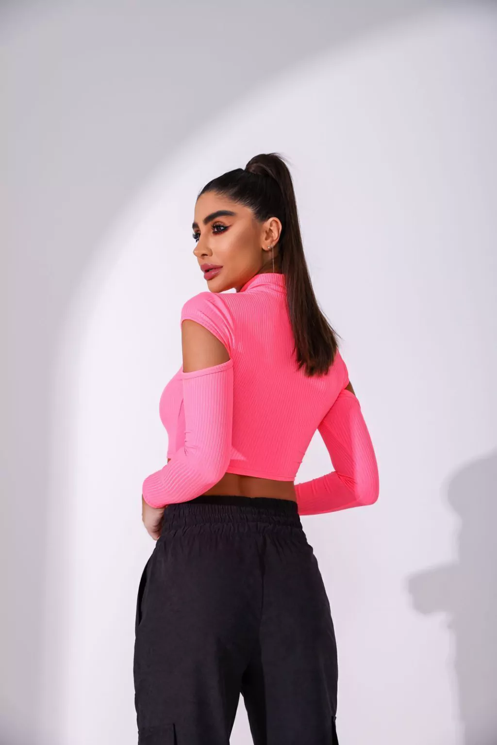 Cropped em malha canelada, com recortes na lateral e frontal, manga longa. Peça possui elastano.