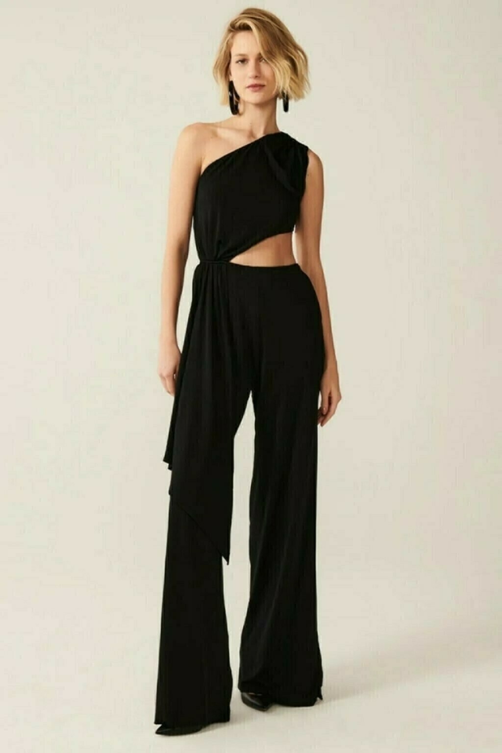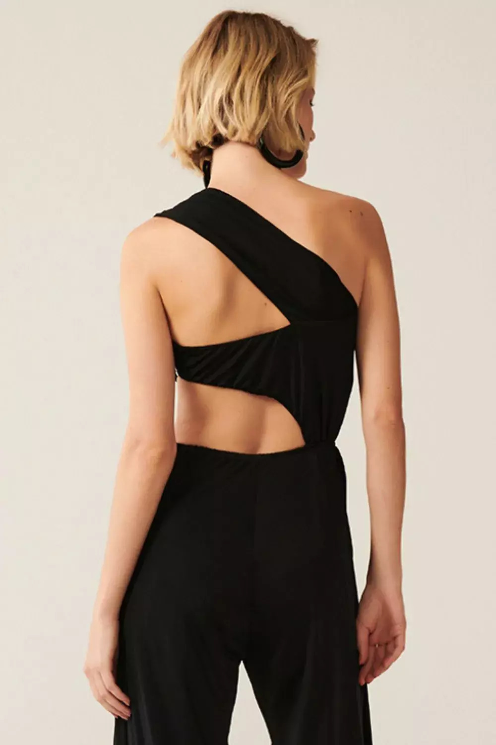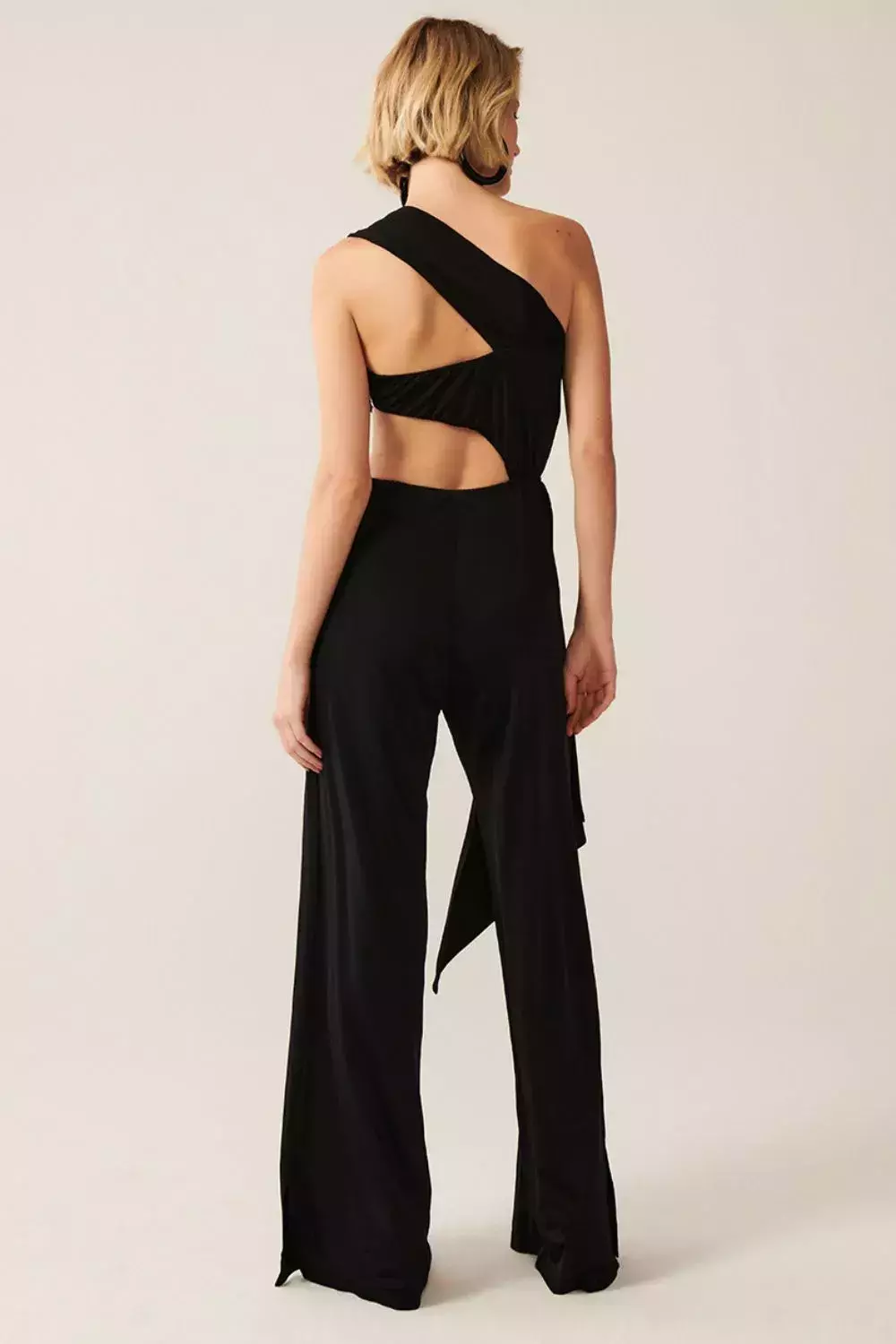 Macacão único e moderno em jersey de viscose, de um ombro só, apresentando um vazado lateral ousado e uma faixa esvoaçante na lateral da calça reta. Ideal para um visual elegante e contemporâneo.