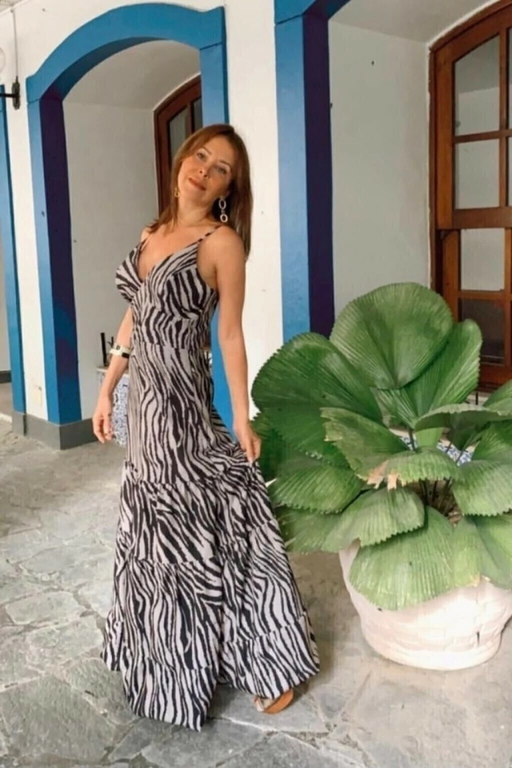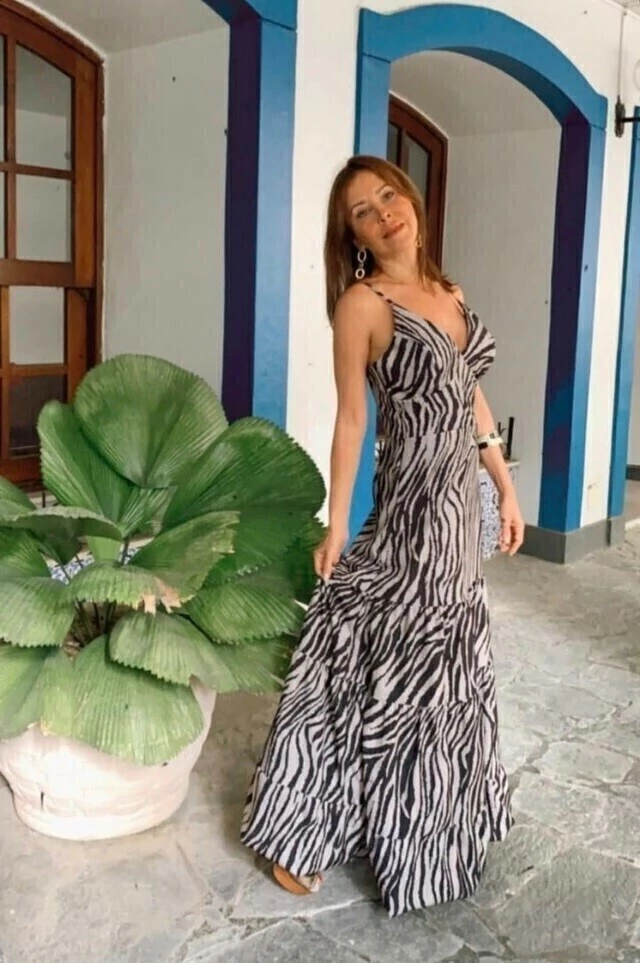 Vestido longo em tecido alfaiataria com estampa animal print zebrada. Possui regulagem na alça e ziper invisivel nas costas.