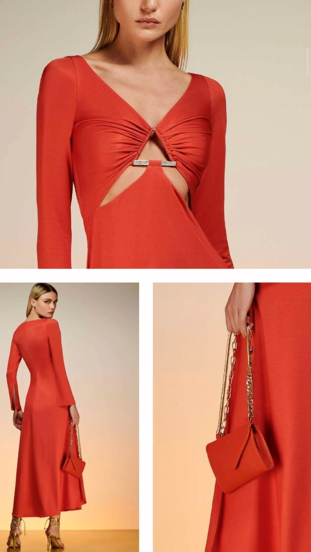 Vestido longo em malha fria, fenda na perna e recortes no busto para trazer elegância e modernidade a peça. Vestido leve e fresco.