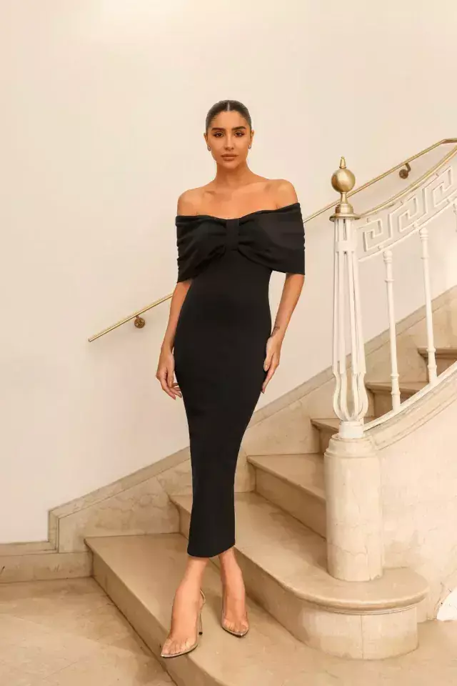 Vestido deslumbrante que junta elegância e sofisticação, é este vestido midi com um lindo detalhe em laço de ombro a ombro trazendo romantismo e delicadeza, com uma fenda posterior linda e fechamento em zíper invisível nas costas. O vestido tem um forro interno e não possui bojo assim trazendo mais conforto ao seu look.